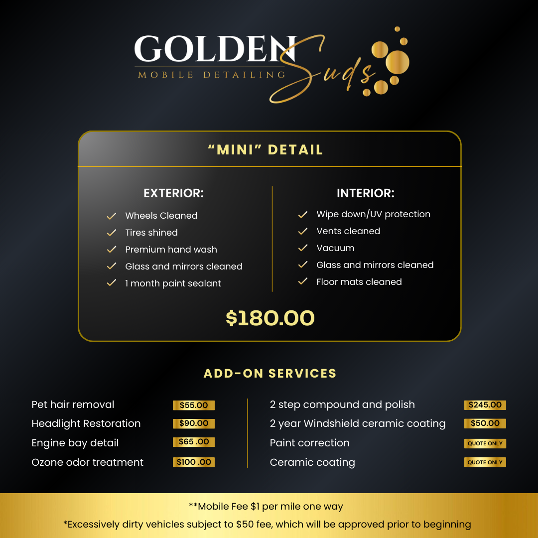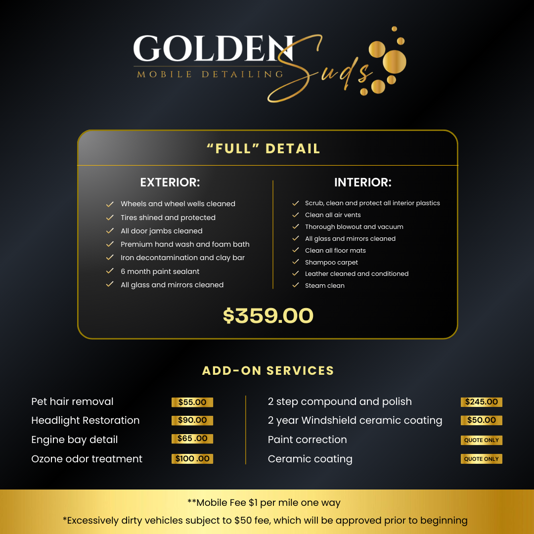 Our detailing packages are designed to deliver exceptional results within the allotted service time. In order to maintain the highest standards and attention to detail, any vehicles requiring extra cleaning due to excessive soiling, pet hair, staining, or other special circumstances may incur an additional charge.